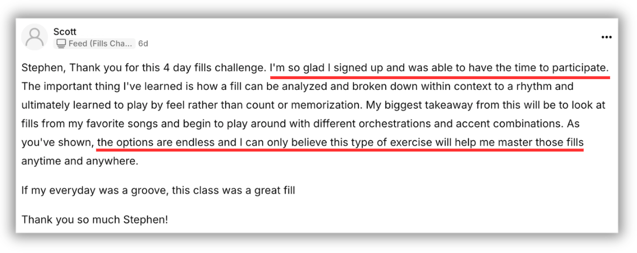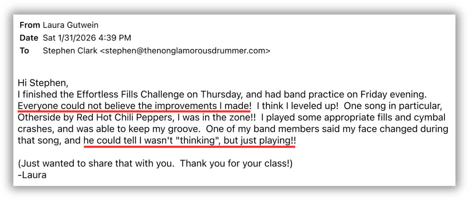 ...Literally whatever questions you have, whether they have to do with fills or hihat adjustment or anything else - I'm here to serve you and give you the clarity & direction you need to keep moving forward.